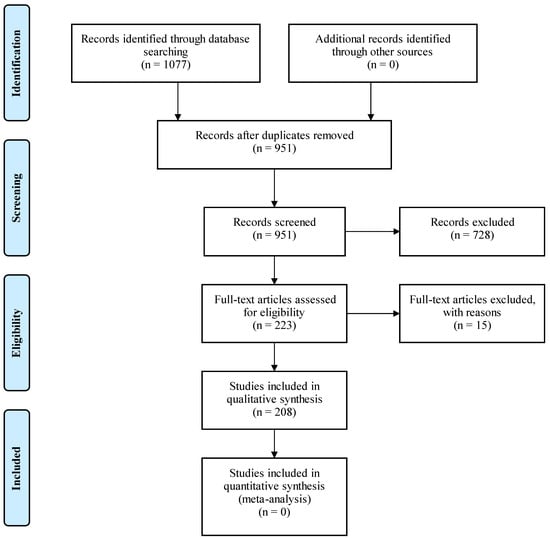 A search was conducted in MEDLINE (via PubMed) in order to retrieve relevant articles. The search terms employed were: hepatocellular carcinoma, targeted therapy, growth factors, tyrosine kinase inhibitors, immunotherapy, and clinical trials. Furthermore, we checked the references of all articles found aiming to include any other eligible studies. The PRISMA approach was used for the selection of the articles included in the review. A total of 1077 records in English were identified. Following removal of the duplicates, 951 records remained. The remaining articles were screened and 730 were excluded for various reasons. Some of them were only abstracts or reviews, whereas others were not completely relevant to the topic. It should be mentioned that publications in non-English languages were also excluded. The number of full-text articles assessed for eligibility was 221, and 206 full-text articles were included. The inclusion process is demonstrated in Figure 1.
