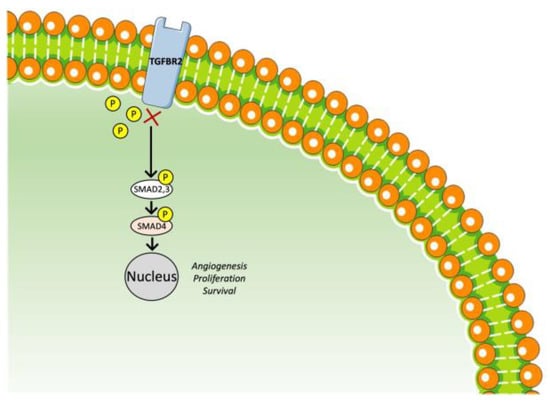 RTK are transmembrane proteins that are responsible for transferring extracellular signals to the intracellular microenvironment, carrying molecules (such as glucose) from one side of the plasma membrane to the other. RTK are activated upon growth factor binding to their specific extracellular domain through dimerization and autophosphorylation of their receptor [,]. The interaction of the phosphorylated receptor with various cytoplasmic signaling molecules, such as the PI3K/AKT/mTOR and RAS/RAF/MEK/ERK pathways, results not only in angiogenesis but also in other processes such as cell survival and the migration, proliferation, and differentiation of endothelial cells.