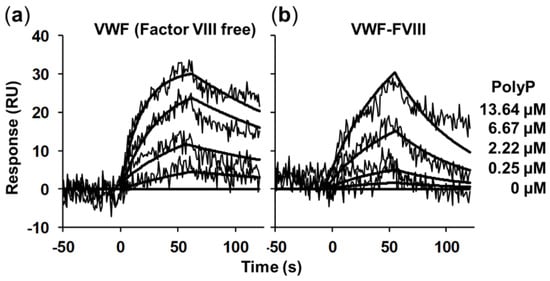 Dynamic interaction between von Willebrand Factor and polyphosphate is stronger in the absence of factor VIII. Surface plasmon resonance analysis of immobilized von Willebrand Factor (factor VIII-free) (VWF) (a) or von Willebrand factor co-purified with factor VIII (VWFFVIII) (b), confronted with increasing concentrations of isolated polyphosphate (polyP65, 0.25–13.34 µM). The corresponding fitted curves are presented as solid lines. A representative experiment is shown (n = 3).