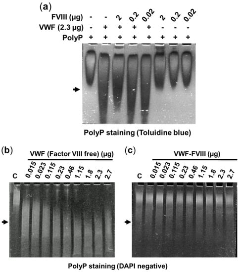 Similar results were observed using urea-PAGE (Figure 2 and Figure S1). As we previously demonstrated, the electrophoretic mobility of polyP65 in urea–PAGE could be modified by the addition of isolated VWF, which migrates faster than free polyP []. The inclusion of purified factor VIII prevented changes in the electrophoretic mobility of polyP65 in a dose-dependent manner (Figure 2a). When we used samples of VWF that contained endogenous factor VIII (VWF co-purified with factor VIII), binding with polyP was not detected (Figure 2c and Figure S1b).