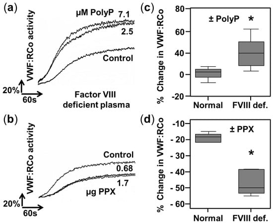PolyP increases the von Willebrand Factor ristocetin cofactor activity in factor VIII-deficient plasmas. (a,b) Aggregation curves of fixed platelets in a ristocetin co-factor activity assay using factor VIII-deficient plasmas. Prior to the assay, 50 µL of plasmas (diluted 1:2) were incubated in the absence (control) or in the presence of (a) isolated polyphosphate (polyP65, 2.5 µM, and 7.1µM) and (b) recombinant yeast exopolyphosphatase (PPX, 0.68 µg, and 1.7 µg). Representative experiments are shown (n = 3). (c,d) Quantification of the differences in von Willebrand factor ristocetin co-factor activity in normal plasmas (Normal) and plasmas depleted of factor VIII (FVIII-def.) after the addition of (c) 2.5 µM of isolated polyphosphate (polyP65) or (d) 1.7µg of recombinant yeast exopolyphosphatase (PPX). For each sample, the change was calculated as “activity without addition of polyP or PPX” minus “activity with the addition of polyP or PPX”; therefore, positive values mean an increase above the basal activity and negative values mean a decrease. Results are presented in a box-and-whiskers plot. An asterisk indicates a statistical difference of p < 0.01, determined by Mann–Whitney test using plasmas of 3 normal individuals vs. factor VIII-depleted plasmas from three different lots. Measurements were performed using an automated aggregometer (Helena AggRAM).
