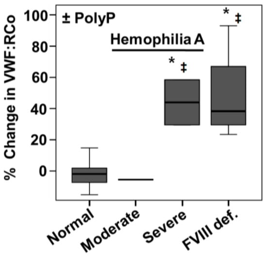 PolyP addition increases the von Willebrand factor activity in plasmas from patients with severe hemophilia A. Experiments were performed as described in Figure 3 but using plasmas from healthy individuals (Normal) and patients with moderate and severe hemophilia A (Moderate, Severe). Quantification of the differences in von Willebrand factor ristocetin co-factor activity after the addition of 2.5 µM of isolated polyphosphate (polyP65). For each sample, the change was calculated as “activity without addition of polyP” minus “activity with the addition of polyP”. For comparison, we also include data from experiments using factor VIII-deficient plasmas (FVIII-def.). Results are presented in a box-and-whiskers plot. Symbols indicate a statistical difference of p < 0.01, determined by Mann–Whitney test, related to “Normal” plasmas (*), or “Moderate hemophilia” (‡) (n = 3). An asterisk indicates a statistical difference of p < 0.01, determined by Mann–Whitney test. Measurements were performed using an automated aggregometer (Helena AggRAM).