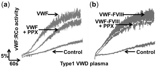 We also tested the effect of polyP depletion with the polyP-degrading enzyme exopolyphosphatase (PPX) in plasmas of type 1 VWD supplemented with VWF (Figure 5). The addition of VWF (factor VIII-free or co-purified with factor VIII) increased the VWF:RCo activity (Figure 5a,b). However, incubation with PPX decreased the VWF:RCo activity only when factor VIII-free VWF was used (Figure 5a).