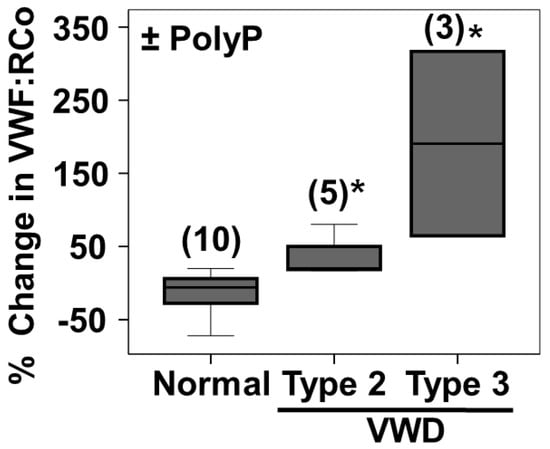 2.5. PolyP Increases VWF Ristocetin Co-factor Activity on Type 2 and Type 3 VWD