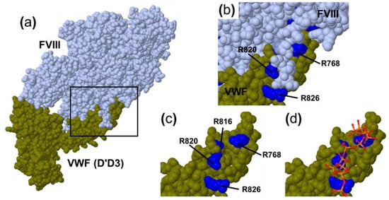 Predicted interaction of polyP with VWF. (a) The most recent structure of the FVIII–VWF complex (D′D3 domain), from reference [] (PDB code 7KWO). The square indicates the area zoomed in on in the other panels of this figure. (b) Interaction between the FVIII-a3 acidic peptide and the VWF-highly basic groove. Arginines are labelled in blue. (c) VWF-highly basic groove without FVIII. (d) PolyP was superposed with the VWF highly basic groove. The model for polyP was extracted from the PDB (code 5LLF). Images were created using Mol* [].
