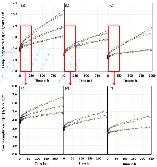 The power coefficient n ranges from 0.35 to 0.55, meaning that the Findley model can describe only primary creep. As the n increases with the initial stresses, it provides enhanced creep. The introduction of glass beads leads to the smaller n indicating the reduction of the creep. Interestingly, n remains unchanged if the upper fitting time limit is increased from 250 h to 1000 h. This makes the Findley model a good tool for practitioners to predict creep behavior from short-term creep experiments [,].