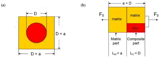 The simplest cube in cube models was proposed by Paul [] and Ishai–Cohen [] in order to calculate Young’s moduli of particle-filled composites. They assume a cubic elementary volume (EV) with edge length D + a containing a single inclusion of diameter D shown for glass beads in Figure 2a. For modeling purposes, the inclusion has to be transformed into a cube. Then the EV is separated into a matrix part and a composite part according to [] as it represents the upper bound, Figure 2b. Thus, the length of the matrix part is increased to LM, and the length of the composite part is decreased to LC.