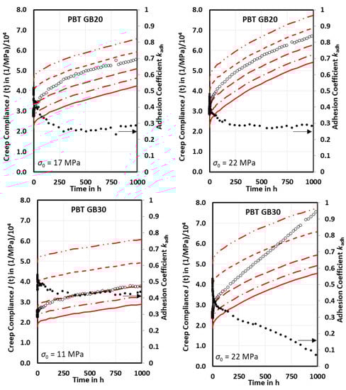 The adhesion factor kadh = 1 leads to the lowest creep compliance curves (solid lines), with values being smaller than measured creep compliance curves, Figure 3. With the lower adhesion factors, the calculated creep compliances achieve coincidence with the measured ones. Furthermore, the slope of the measured creep compliance curves exceeds the slope of the calculated ones. This means that the adhesion factor decreases with time. A pointwise evaluation provides the time-dependent adhesion function, Figure 3. Over 250 h, the adhesion factors kadh decrease from 0.55 to 0.36 (PBT GB20 at σ0 = 17 MPa), 0.50 to 0.32 (PBT GB20 at σ0 = 22 MPa), 0.53 to 0.45 (PBT GB30 at σ0 = 11 MPa), and 0.57 to 0.34 (PBT GB30 at σ0 = 22 MPa) and it decreases faster at the higher initial stresses. Between 250 and 1000 h, the adhesion factors tend towards an asymptotic final adhesion factor except for PBT GB30 at σ0 = 22 MPa, which decreases linearly due to the secondary creep. The adhesion factors were found to decrease logarithmically with time. Therefore, the time-dependent adhesion factors were fitted using the function