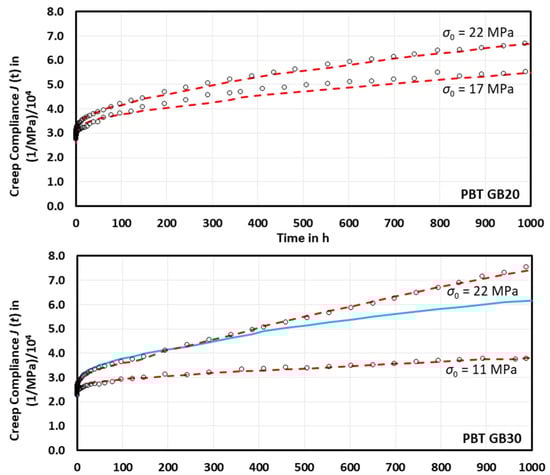 Comparison of initial stress-dependent measured creep compliances (o) of PBT GB20 and PBT GB30 to calculated creep compliances (dashed lines) using Equations (15) and (16); full line represents the extrapolation of 250 h fit.