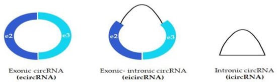 In this respect, circRNAs can be divided into three types depending on the derivative of components: ecircRNAs (formed from exons) [], icircRNAs (formed from introns) [] and eicircRNAs (formed both from exons and introns) [] (Figure 2). Most of the known circRNAs are formed from exons, while ecircRNAs and eicircRNAs only constitute their small pool [].