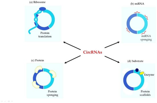 Compared with miRNA and lncRNA, studies on circRNA are still insufficient and require much commitment. It has been demonstrated that circRNAs play an important role at many developmental stages and pathophysiological conditions: acting as miRNA sponges [], interacting with RNA-binding proteins (RBP) [], acting as transcription or translation regulators [], affecting pre-mRNA splicing [] and also participating in translation of proteins [] (Figure 3). The most frequently described function of circRNAs is the activity as a miRNA sponge. The term “miRNA sponges” highlights the function of circRNAs as competitive inhibitors, which contain multiple miRNA-binding sites and prevent miRNAs from binding to mRNA targets. CircRNAs comprise miRNA response elements (MREs), which advance binding between circRNA and miRNA. Such binding leads to a reduction of the target gene expression through degradation of RNA-induced silencing complex, or through limitation of mRNA translation [,,]. This reaction can also reduce the level of functional miRNAs and increase the expression of target mRNAs [,].