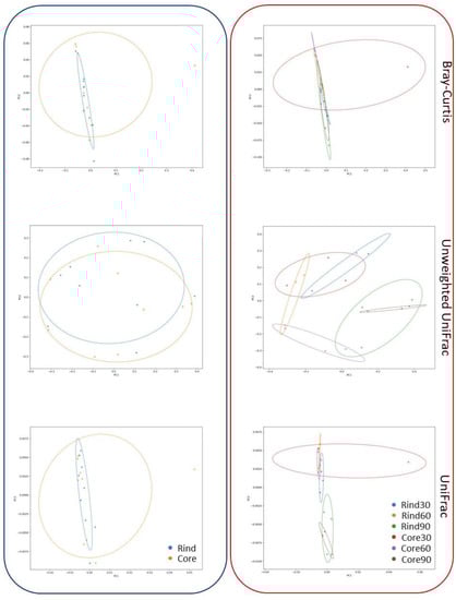 Data from the DNA-based investigations were assembled in data matrices according to the Bray–Curtis similarity and the weighted and unweighted UniFrac, as depicted in the PCO plots in Figure 1. Here, the sample ordination produced a scattered pattern of 16S rRNA profiles, preventing a clear distinction between the microbial communities harbored in the rind and the core samples, as well as between the microbiota at different cheese ripening stages (p > 0.05).