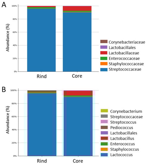 Microbiota composition assessment by 16S rRNA gene sequencing. The bar charts visualize the composition of the microbial community harbored in the rind and core of the cheese wheel regardless of the ripening timepoint. (A) Microbiota composition at the family taxon level; (B) microbiota composition at the genus level. Higher taxonomic levels are displayed in both (A,B) when it was not possible to attribute a family or genus to the OTU, respectively.