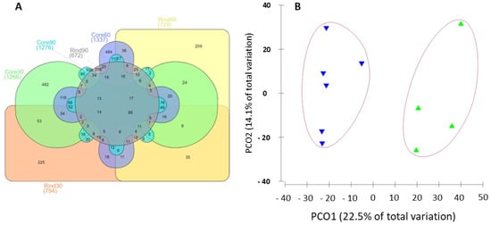 Metaproteomics dataset. (A) The identified proteins. The Venn diagram displays the number of proteins identified in each of the sample groups taken into consideration in the present study. Specifically, the diagram shows the size of the metaproteome identified in the rind and core samples at the ripening timepoints of 30, 60, and 90 days. (B) The ordination of the dataset in a PCO plot, highlighting the clear separation of the rind and core samples according to their identified protein repertoires.