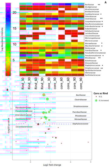 Microbiota composition based on the identified protein repertoire. (A) Quantitative composition of the microbial communities harbored in the rind and core of the cheese wheel at 30, 60, and 90 days of ripening. T-tests on a sample group basis (i.e., rind and core) were performed to highlight the contributors to the statistically significant differences in the structure of the microbiota between the rind and the core. Single and double asterisks indicate p < 0.05 and p < 0.01, respectively. (B) Volcano plot summarizing the bacterial families significantly overrepresented in the core samples (green circles) according to the T-test analysis. Non-statistically significant bacterial families are represented by red circles. The average intensity of each bacterial family is indicated by the diameter of its circle.
