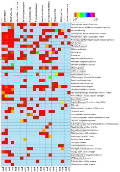 The functional characterization of the cheese microbiota was accomplished by sorting the identified protein repertoire using a variety of protein ontology data repositories, such as Gene Ontology (GO), PFAM, and TIGRFAM. A detailed overview of the functional classification of the identified protein repertoire is provided in Additional File S6. Altogether, the functional classification revealed differences in the activities of the rind- and core-associated microbiota (p < 0.01) according to the functional classification data repositories. Besides ANOVA, further statistical evaluations underlined the “blind” grouping of the microbial communities harbored in the rind and core of the cheese wheel according to their different functional profiles. In line with the previous observations, no statically significant differences were observed between microbial communities at the selected ripening timepoints (p > 0.05) (Additional File S7). Protein sorting based on the GO biological processes provided an overview of the major functional concerns of the microbiota in the rind and core samples. The rind-associated microbiota was intensively involved in the “antibiotic catabolic process”, the “cellulose biosynthetic process”, the “glutamine metabolic process”, and “histidyl-tRNA aminoacylation” as compared with its core counterpart. On the other hand, the core microbiota was exclusively involved in biological processes such as “polyketide metabolism” and “siderophore biosynthesis”. Additionally, the core microbiota was much more involved in biological processes such as “carbohydrate derivative metabolism”, “cell division”, and the “phosphorelay signal transduction system” (Figure 5). A deeper investigation of the functional data elucidated the bacterial families principally involved in the biological processes peculiar to each microbiota. In the rind microbiota, the family Rhizobiaceae was the main player in the “antibiotic catabolic process”, suggesting that bacterial organisms of environmental origin were the principal target of the antibiotic-based defense. The “cellulose biosynthetic process” was led by the Enterobacteriaceae, whereas the “histidyl-tRNA aminoacylation” biological process was accomplished by the Bacillaceae and Clostridiaceae (Figure 5).