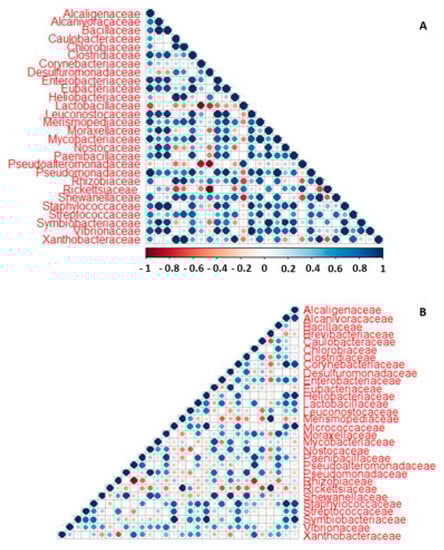 Correlogram analysis. The correlations computed among the members of the microbial communities harbored in the rind and core of the cheese wheel are depicted in panels (A,B), respectively.