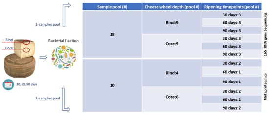 Bacterial fractions were isolated from the rind and core of the cheese wheel at 30, 60, and 90 days of ripening. Pooling was performed, with each pool including bacterial extracts from three samples. Eighteen pools were subjected to 16S rRNA gene sequencing, 9 from the rind and 9 from the core. Each depth was composed of 3 sample pools taken from cheese wheels ripened for 30, 60, and 90 days. The metaproteomics survey relied on a total of 10 sample pools, 4 for the rind and 6 for the core depth. Two pools were considered from each ripening timepoint of the core depth, whereas two pools were excluded in the rind groups due to technical issues encountered during the analytical workflow. Specifically, one pool was omitted from the pool at 60 days and one from the group at 90 days of ripening.