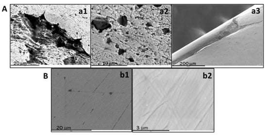 SEM images of a commercial 18K gold quaternary alloy (Au-Ag-Cu-Zn) wire (A) and plate (B). Hollows caused by shrinkage (a1), cooling (a2), and fracture by stretching (a3). Surface micrographs at low (b1) and high magnification (b2).