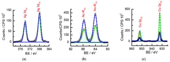 X-ray photoelectron spectroscopy (XPS) analyses were performed with a SPECS Phoibos 150 MCD spectrometer using non-monochromatized (12 kV, 300 W) Mg KR radiation (1253.6 eV). Samples were mounted on a steel sample holder and directly introduced into the XPS analytical chamber. The working pressure was <5 × 10−9 Pa. The spectra were collected using a take-off angle of 45° with respect to the sample surface plane. The spectrometer was calibrated assuming the binding energy (BE) of the Au 4f7/2 line at 84.0 eV. The standard deviation for the BE values was 0.2 eV. Survey scans were run in the 0–1100 eV range (pass energy = 60 eV), while detailed scans were recorded for the Au 4f, Ag 3d, Cu 2p, and Zn 2p regions. The analysis involved Shirley background subtraction, and, whenever necessary, spectral deconvolution was carried out by nonlinear least-squares curve fitting, adopting a Gaussian sum function.