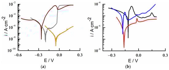 Polarization curves were recorded in a standard saline solution of 3.5% NaCl to observe durability and resistance of the gold alloys. The study includes samples of its major components, Au, Ag, and Cu, as pure metals. The samples were kept in solution at open circuit (OC) during the time required to reach an equilibrium potential (OCP). Potentiodynamic curves were obtained in a potential range centered at the OCP value. The scan rate was 1 mV/s and curves were plotted as log (j/μA·cm−2) vs. E (mV), allowing for the determination of Tafel slopes, corrosion potential (Ecorr), and current (Icorr) of the samples [,,,] (Figure 3).