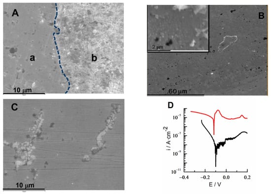 After polarizing a 18K gold alloy to anodic potentials, the substrate surface was inspected by SEM. Figure 4A shows an image of the boundary region that delimits both non-immersed and immersed zones of the substrate in a saline solution. A significant increase in roughness was observed at both low- and high-resolution images for high anodic polarization potentials (E > Ecorr, i.e., E close to +1 V). SEM-EDX analysis in the corrosion zone showed the presence of chloride ions and a decrease in the Au surface composition concomitantly with the precipitation of salt microcrystals on the surface (Figure 4A,B).