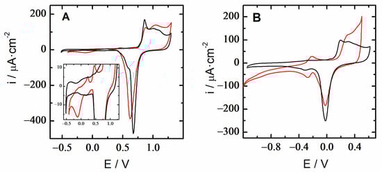 A comparison of the electrochemical i-E profiles of the 18-carat quaternary gold alloy and polycrystalline gold electrodes was carried out in 10 mM HClO4 and 0.1 M NaOH aqueous solutions (Figure 5). The polycrystalline gold response in an acid medium showed only gold surface oxidation during the anodic scan and stripping of the gold oxides in the reverse one. The i-E response of the 18K gold electrode followed a similar pattern, but it was additionally observed for a faradaic current in the double layer region. A closer look at this region showed the presence of a pair of voltametric peaks centered at 0.35 and 0.1 V, which could be assigned to silver and copper, respectively []. In a basic medium, such differences between both gold and alloy substrates were emphasized. Thus, the electrochemical response was sensitive to the alloy composition, consistent with the fact that only 75% of the content of the tested samples was gold.