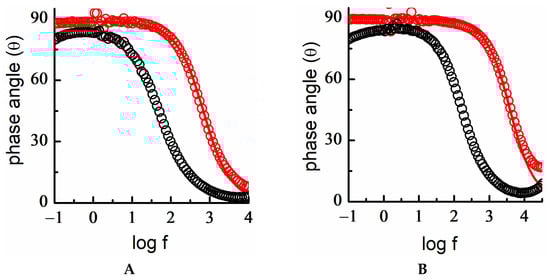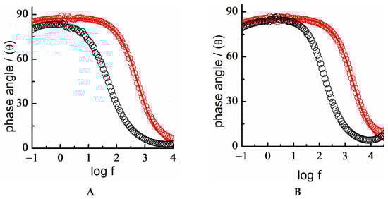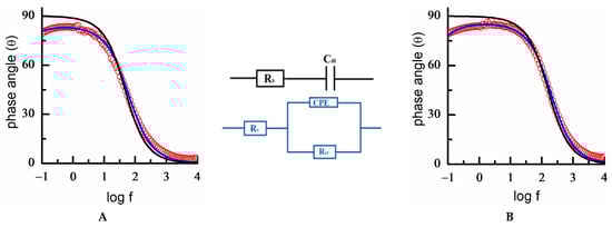 A study of the interfacial properties was performed by electrochemical impedance spectroscopy (EIS), both in acidic and basic media. The EIS analysis of 18K gold alloys revealed that the double-layer region did not behave as an ideal capacitor []. In this case, a typical experimental Bode plot showed a clear deviation at low frequencies from 90°, the theoretical value of the phase angle for a capacitor (Figure 6). Therefore, the experimental data did not fit to a pure series RC equivalent circuit, and it was necessary to replace the ideal capacitor by a constant phase element (CPE or Q []). Additionally, as in the present system, adding a parallel resistance to properly simulate the interphase was also required, which was represented by a R(QR) equivalent circuit, where the parenthesis indicates a parallel disposition of both R and Q elements in series with the solution resistance. This feature shows a non-ideal behavior of the interphase, and clearly indicates the lack of homogeneity of the alloy surface compared with the gold polyfaceted surface [,].