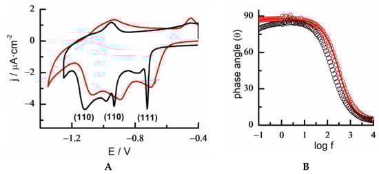 (A) Cyclic voltammograms of the reductive desorption of 6MP-SAM in KOH 0.1 M on Au 18K gold alloy plate (red) and polyfaceted gold bead (black). Scan rate 0.02 V/s. (B) Electrochemical impedance spectra. Bode plot of a 1 × 1 cm2 square plate of 18K gold alloy. Variation of the phase angle with the frequency of the bare alloy (black circle) and 6MP-SAM/alloy (red circle). Edc = −0.3 V. Fitting of experimental data to a [R(RQ)] equivalent circuit (red line).