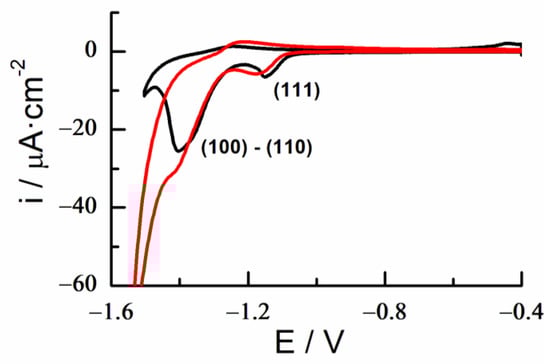 Cyclic voltammograms of the reductive desorption of MUA-SAMs on Au 18K (red) and polyfaceted gold (black) in KOH 0.1M. Scan rate 0.02 V/s.