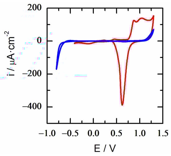 As it happens with 6MP monolayers on Au 18K, it is not possible to reductively desorb the DT layer from this surface in an acidic medium without concomitantly causing proton reduction from the aqueous medium at sufficiently negative potentials (Figure 9). However, the presence of the DT monolayer can be easily detected under these conditions because the DT-SAM protects the substrate in a wide range of potentials, preventing surface faradic reactions within the stability zone of the monolayer. Such anodic/cathodic stability potential regions range from +1.0 to −0.5 V. Beyond these limits, the onset of the oxidative and reductive desorption of the monolayer appears, together with the surface oxidation of the alloy and/or the hydrogen evolution reaction at higher overpotentials (~up to 0.5 V), respectively.