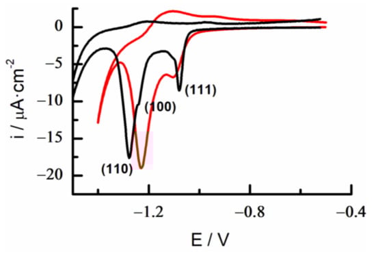 The 6MP-SAM was formed by immersion of an 18-carat gold alloy sample in an aqueous diluted acidic solution (100 μM 6MP, HClO4 0.01 M) during a time interval that varied from two minutes to several hours. An optimum immersion time of 10 min was selected to completely assure the formation of a highly ordered 6MP monolayer. One of the most common ways to characterize SAMs is the use of electrochemical methods. A scan to negative potentials from the double-layer region allowed for observation of the reductive desorption of the 6MP-SAM modified gold electrode, a special case of SAM that is extremely sensitive to surface atomic order and crystallinity [,]. The modified gold electrode was immersed in an alkaline solution, free of adsorbate, which usually led to multiple peak-shaped signals in cyclic voltammetry, due to surface-confined reduction reactions ascribed to the S-Au bond breakage taking place at different crystallographic surface sites. Reversing the potential may produce the re-adsorption of the thiols on the metal surface that were not able to diffuse far away enough from the interfacial layer. The reductive desorption process (RD) of the molecules bound by a metal–sulphur bond allows for an estimation of the thiol surface coverage and SAM packing, according to Equation (1).