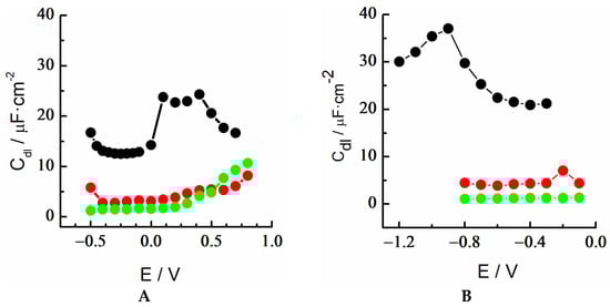 Variation of double-layer capacitance vs. potential of Au 18K (black); MUA-SAM/Au18K (red), and DT-SAM/Au18K (green) in (A) acidic medium and (B) basic medium.