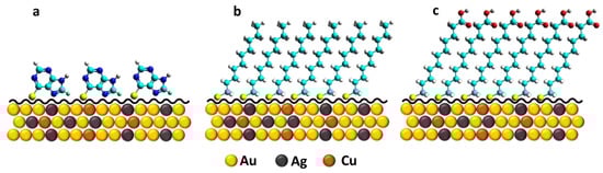 SAM interfaces built-in on 18K gold alloy surfaces: (a) 6MP, (b) DT, and (c) MUA. Zn atoms are not shown considering its surface proportion is below the minimum threshold of the total atoms depicted here.