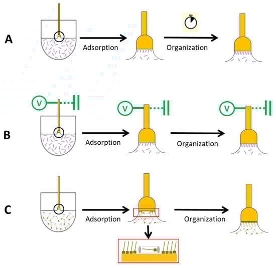 SAM formation approaches by dipping in ethanolic or aqueous solution (A), under electrochemical control (B), and in a micellar medium (C).