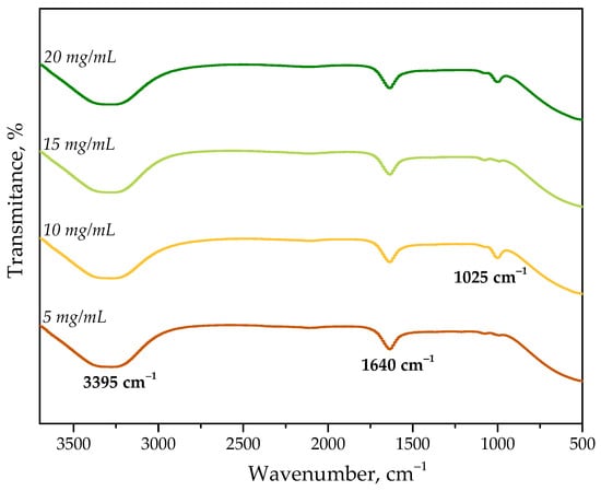 FT-IR spectroscopy confirmed the occurrence of the absorption bands characteristic for applied protein. The wide absorption band with a maximum at approximately 3395 cm−1 may be assigned to the stretching vibrations of -OH and -NH2 groups. Next, the band visible at approximately 1640 cm−1 corresponds to the vibrations of amide I bond while the band observed at 1025 cm−1 is characteristic for the stretching vibrations of C-O bond [,,]. All mentioned absorption bands are characteristic for albumin and thus confirm its presence as it was in the case of the results of UV-Vis spectroscopy.