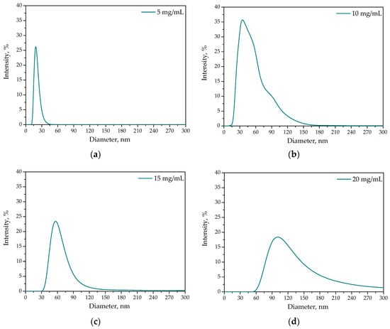 Results of DLS analysis of protein particles obtained using albumin solution at a concentration of 5 mg/mL (a), 10 mg/mL (b), 15 mg/mL (c) and 20 mg/mL (d).