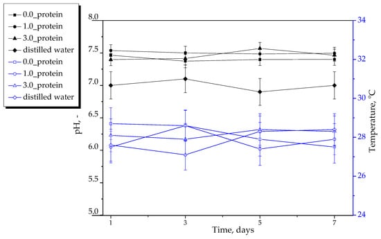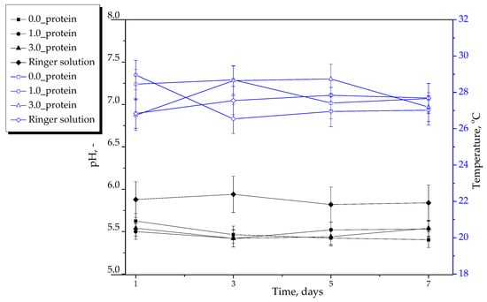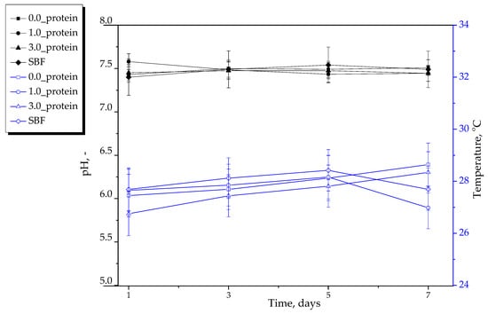 Next study concerned determining the mutual interactions between the developed hydrogels and the simulated physiological liquids. For this purpose, hydrogel samples were immersed in selected liquids—i.e., SBF, Ringer liquid and distilled water—for 7 days. During this period the pH and the temperature of the incubation media were measured every two days via a multifunctional ELMETRON CX-701 (Elmetron, Zabrze, Poland) meter. The incubation was performed at 37 °C to simulate human body temperature.