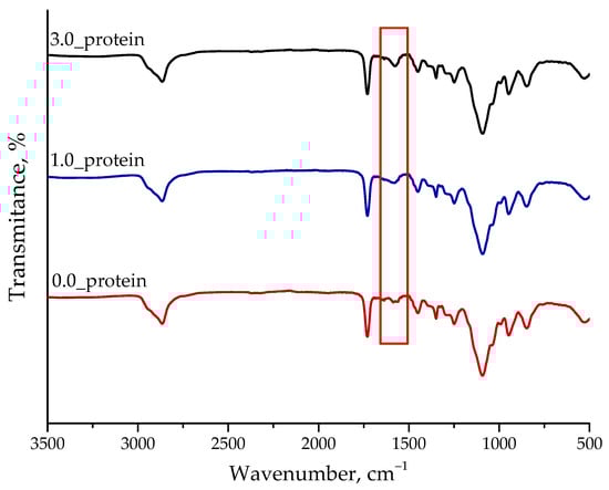FT-IR spectra of unmodified hydrogel (sample 0.0_protein, red) and hydrogels containing protein particles (i.e., samples: 1.0_protein (blue) and 3.0_protein (black)).