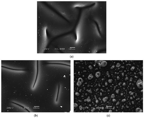 In above-presented SEM images, the surface morphology of both unmodified hydrogel materials and materials incorporated with protein particles was shown. In the case of material modified with lower amount of the protein particles—i.e., 1.0_protein—its surface morphology seems to be very similar to the surface morphology of unmodified hydrogel. Referring to the results of DLS analysis, the average diameter of the particles obtained was approximately 35 nm therefore this protein is not visible in the SEM images whereas the surface morphology of modified materials seems to be homogeneous. However, the introduction of higher amount of this modifier, i.e., 3.0 mg/1 g hydrogel (3.0_protein), leads probably to the formation of the protein agglomerates which may be observed in Figure 9c. Based on the results obtained, it may be stated that the system showing greater homogeneity was obtained for sample containing 1.0 mg albumin/1.0 g hydrogel (so sample 1.0_protein) wherein the preparation of a homogeneous material with greater amount of the modifying substance (so sample 3.0_protein) requires probably an additional step including the disintegration of protein agglomerates (using e.g., ultrasounds or homogenizer).