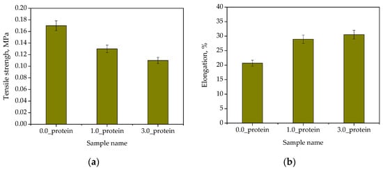Next, studies aimed at verifying the mechanical properties of developed materials while the main attention during the analysis was paid to defining the impact of the protein content on these properties. The study was performed in triplicate. The results are presented in Figure 10 in the form of bar charts showing the average values with corresponding standard deviations (SD, shown as error bars).