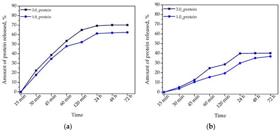 Results of the protein release from hydrogels in the environment with pH = 2.0 (a) and pH = 7.4 (b).