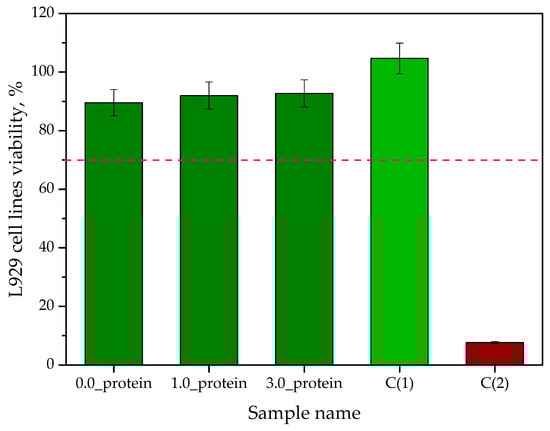 The evaluation of the cytotoxic effect of materials intended for biomedical purposes performed in in vitro conditions is an extremely important introduction for further, more advanced, biological and toxicological studies. A series of detailed biological analyses allows for the verification of the safety in the use of a given material which translates into its classification or rejection for further research stages including in vivo analyses. MTT reduction assay is one of the basic tests in the biological evaluation of candidate materials for medical devices. According to EN ISO 10993-5: 2009 standard [], a material is considered non-toxic towards an analyzed cell line when the survival rate of the cells treated with this material for 24 h is above 70% (it has been marked with red dotted line in Figure 12). In the case of the developed hydrogels, this requirement was met while the murine fibroblast viability was 89.545 for the unmodified hydrogels, and for modified 91.98% (1.0_protein) and 92.73% (3.0_protein), respectively. It may be observed that the addition of the albumin particles increased the viability of tested cell lines. The changes are slight but consistent with the results presented by other researchers. For example, Gonzalez Porto et al. proved that the addition of albumin increased the viability of Schwann cells (cells building the myelin sheaths around peripheral nerves) []. In turn, Ashman et al. indicated that the albumin stimulates the proliferation of proximal tubular epithelial cells [].