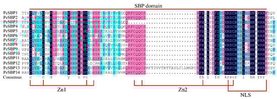 Multiple sequence alignment of SBP domains of PeSBP proteins. The darkblue, purple, and lightblue backgrounds indicate entire conservative residues, 75% conservative residues, and 50% conservative residues respectively.