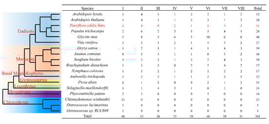 The SBP gene family is a plant-specific transcription factor family widely found in green plants, and it plays a crucial role in plant growth and development, physiological and biochemical activities, and environmental response []. Passion fruit is a famous tropical and subtropical crop which has extensive economic value []. However, only a few studies on the SBP gene family in passion fruit exist. In this study, a total of 14 SBP genes were identified from the passion fruit genome via the bioinformatics method, which was similar in number to other eudicot plants, like Arabidopsis thaliana (16), Arabidopsis lyrata (15), and Vitis vinifera (17), but fewer in number than Glycine max (46) and Populus trichocarpa (28), suggesting that SBP genes in different eudicot species underwent different gene duplication events []. There was only one SBP gene in Ostrecocus lucimarinus and Ostrecocus sp. rcc809 in group I, leading us to speculate that the SBP gene of group I might be their ancestor. We found that the number of SBP genes increased in terrestrial plants, and gene expansion was intensified strongly in angiosperms, which may reflect the flowering plants’ effectiveness in adapting to the different unstable environmental conditions []. According to phylogenetic tree analysis, the SBP gene family of passion fruit could be divided into eight groups. This result is consistent with previous SBP gene studies in other plants []. No PeSBP gene belonging to group III was identified. Whether these genes were lost in the evolution of passion fruit remains to be explored. Most PeSBP genes were clustered closely with the SBP family genes of grape and Arabidopsis but were far away from the SBP genes of rice. This finding is consistent with the fact that passion fruit, grape, and Arabidopsis are eudicot plants. Compared with the lineage that led to the formation of monocots, it is closer to the divergence in evolution from a common ancestor.