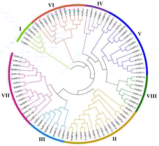To analyze the phylogeny of the SBP gene family, a total of 301 SBP homologs were selected from 18 representative plants from seven green plant families. Among these plants, the soybean had the maximum number of SBP genes, with 46 members. However, only one SBP gene in group I was found in Ostrecocus lucimarinus and Ostrecocus sp. rcc809 (Figure 2). To further understand the phylogenetic relationship of the PeSBP gene family, a phylogenetic tree was constructed using SBP proteins of passion fruit, Arabidopsis, grape, sorghum, and rice. Among them, passion fruit, Arabidopsis, and grape belong to eudicots, while sorghum and rice belong to monocots. According to the unrooted phylogenetic tree, 14 PeSBPs could be divided into 8 groups (I to VIII). Four PeSBPs belonged to group II, while none belonged to group III. There was only one member of PeSBP in groups I, V, and VIII. The homology between the PeSBPs gene and the VvSBPs was relatively high, and the similarity between their protein sequences indicates that the SBP gene of these two species may have similar biological functions (Figure 3).