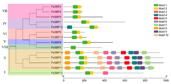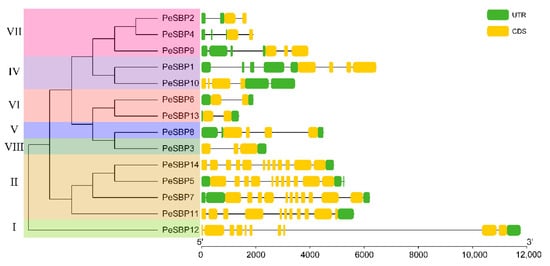 The structure of each gene, especially the number and distribution of exon and intron, may be closely related to evolution. To better understand the diversity of PeSBP gene structure, the coding sequence of each gene was compared with its corresponding genomic sequence. The number of exons varied from 2 to 12. The number of introns in group II was the maximum, while all PeSBP genes in group VI only contained 1 intron, which was the lowest number. Group VII contained two to five introns, and group V contained 4 introns (Figure 4). In group II, PeSBP5, PeSBP7, PeSBP 11, and PeSBP14 in the evolutionary tree may have been cleaved and polymerized during the evolutionary process. The results showed that the number of exons and introns was highly variable in different groups, while the number of exons was nearly consistent in the same group.