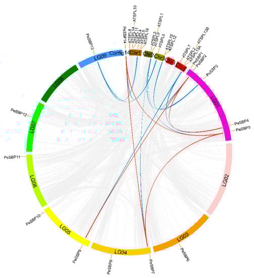 Gene duplication events (segmental and tandem) are the major driving forces for finding novel genes and gene family expansion which can support the adaptation of organisms to different complex environments []. Collinearity analysis mainly evaluates the remaining and lost duplication genes through homology comparison. It can provide an important basis for studying the evolutionary history of genes by comparing the homologous gene sequences of different plant genomes []. Colinear analysis revealed the evolutionary relationship between homologous gene pairs within passion fruit and between passion fruit and Arabidopsis. A total of 5 segmental duplication events of collinear genes were found within passion fruit, and 11 duplication synteny gene pairs were found between passion fruit and Arabidopsis, indicating segmental duplication events produced the diversity of PeSBPs. The Ka/Ks values of SBP collinearity gene pairs in all identified homologous gene pairs were less than 1, suggesting that SBP collinearity gene pairs underwent purification selection in the evolution process with no functional change.