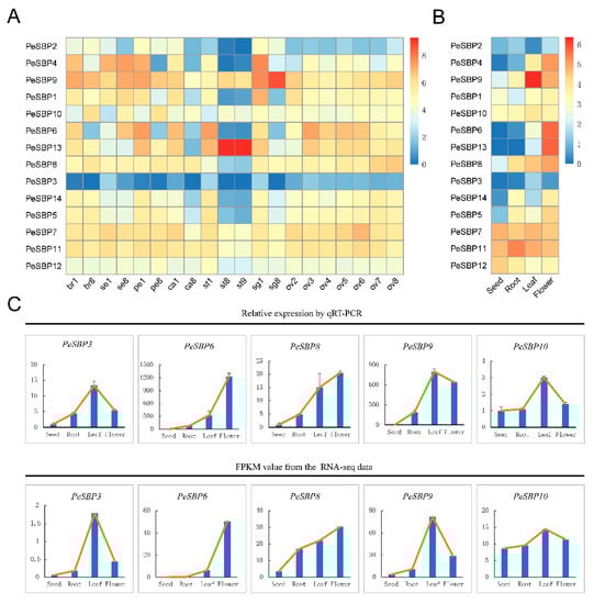 Furthermore, to validate the expression patterns of the PeSBP genes in the root, leaf, seed, and flower tissues, five PeSBP genes (PeSBP3, PeSBP6, PeSBP8, PeSBP9, and PeSBP10) were randomly selected to test their expression level in these four tissues by qRT-PCR. The qRT-PCR results were consistent with our RNA-sequencing results (Figure 7C), suggesting that all the PeSBP gene expression patterns in different tissues are reliable.