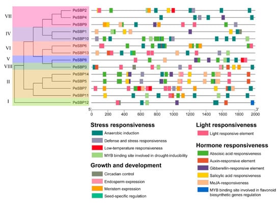 The promoter sequence of PeSBP genes was 2 kb upstream of the transcriptional start site (ATG). The cis-elements of the promoter of the PeSBP genes were predicted using the Plant Cis-Acting Regulatory Element (PlantCARE, http://bioinformatics.psb.ugent.be/webtools/plantcare/html/ (accessed on 19 December 2021)) [].